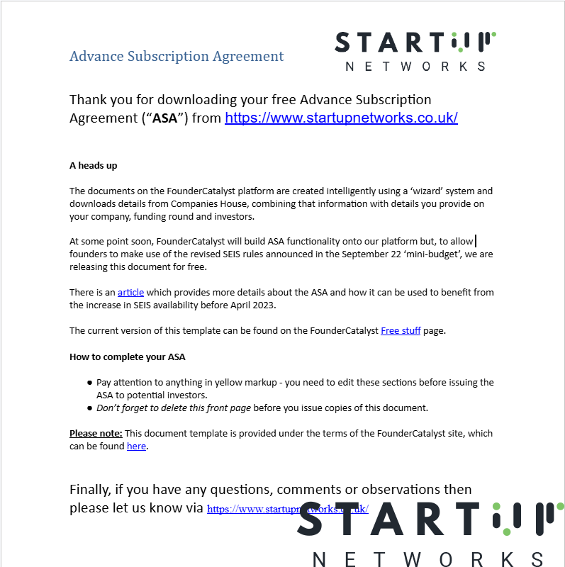 This Advance Subscription Agreement (ASA) Template is designed to help founders secure investment in their business by offering shares to investors at a future date. It ensures compliance with the revised SEIS rules and allows businesses to raise funds through advance subscriptions.