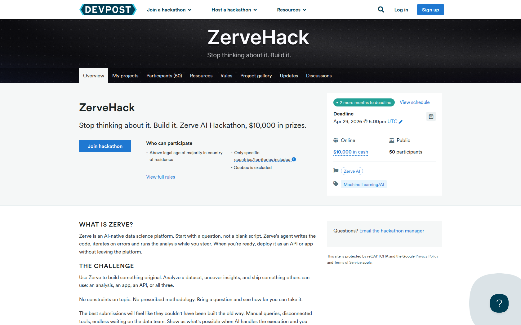 Use Zerve to build something original. Analyze a dataset, uncover insights, and ship something others can use: an analysis, an app, an API, or all three.