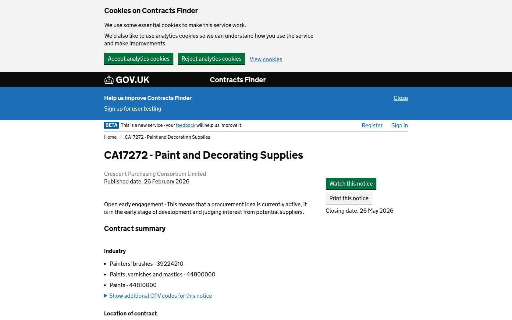 This is an information gathering exercise named Preliminary Market Engagement. The purpose of this exercise is to gather information from suppliers who provide Paint and decorating supplies ,outlined within the document available on Multiquote, to assist in forming the framework to meet the members requirement. Any resulting framework from this exercise will be available to CPC Members (https://www.thecpc.ac.uk/members/regions.php) and all CPC future members (https://www.gov.uk/guidance/get-information-about-schools). This framework will also be open to NWUPC (www.nwupc.ac.uk/members/) and NEUPC (www.neupc.ac.uk/join/members)