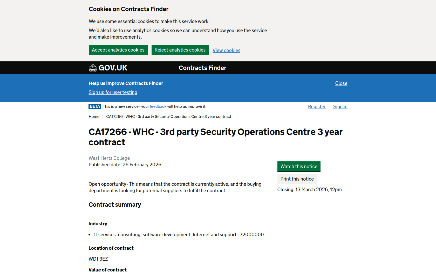 At West Herts we are looking to build a 3rd party Security Operation Centre function that will be managed via the West Herts security team.