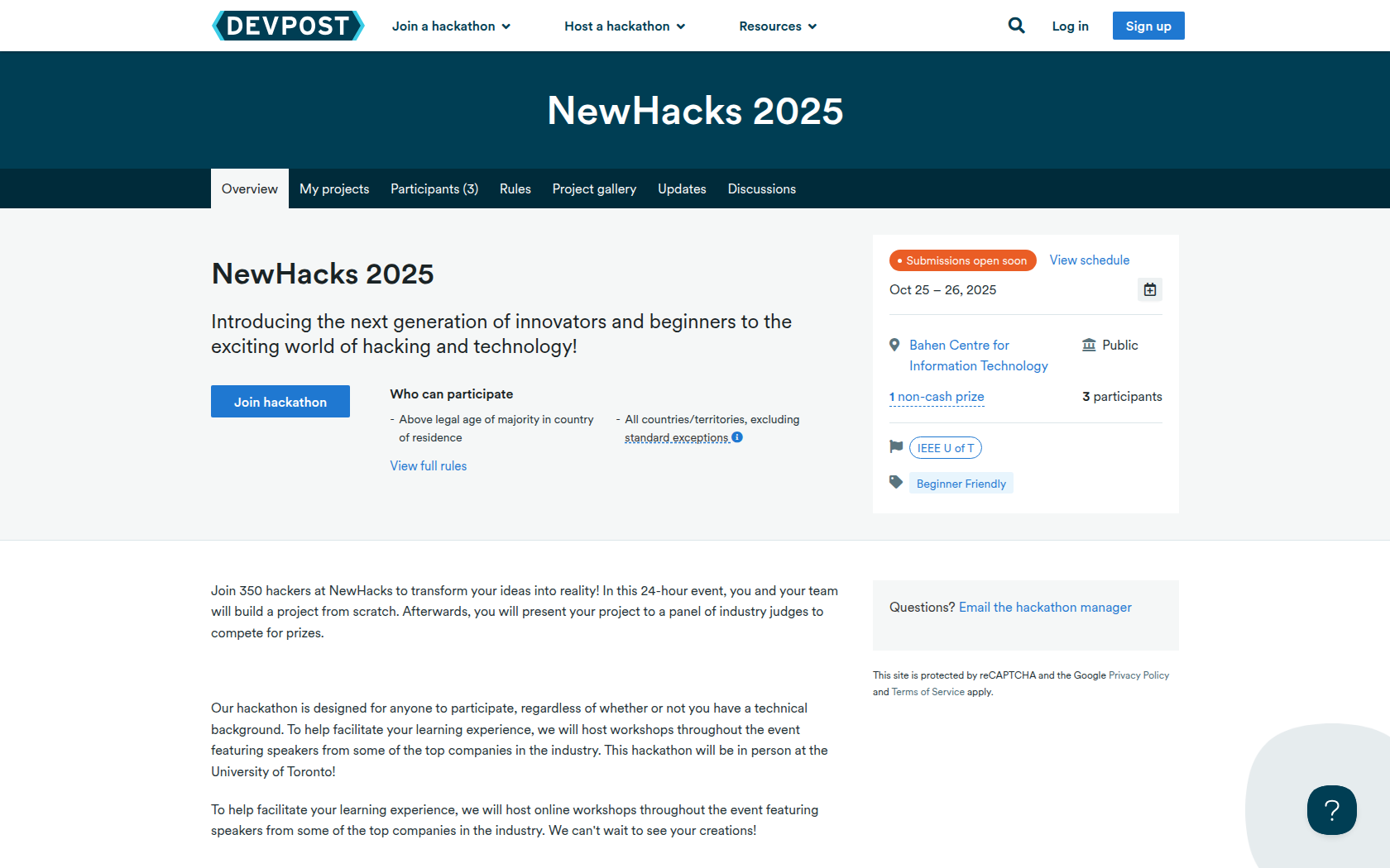 It is always good to link it to your Devpost project in case other groups want to check it out. Please ensure that you select all of the prize categories that you wish to be considered for!