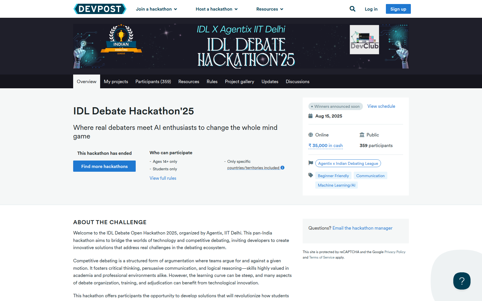Welcome to the IDL Debate Open Hackathon 2025, organized by Agentix, IIT Delhi. This pan-India hackathon aims to bridge the worlds of technology and competitive debating, inviting developers to create innovative solutions that address real challenges in the debating ecosystem.