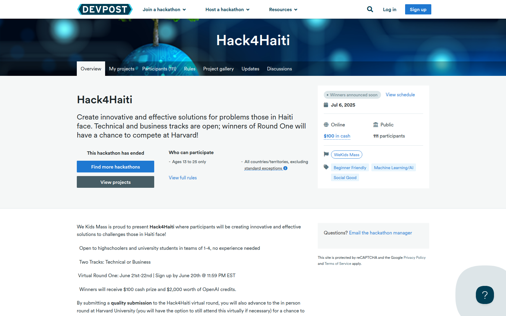 We Kids Mass is proud to present Hack4Haiti where participants will be creating innovative and effective solutions to challenges those in Haiti face!