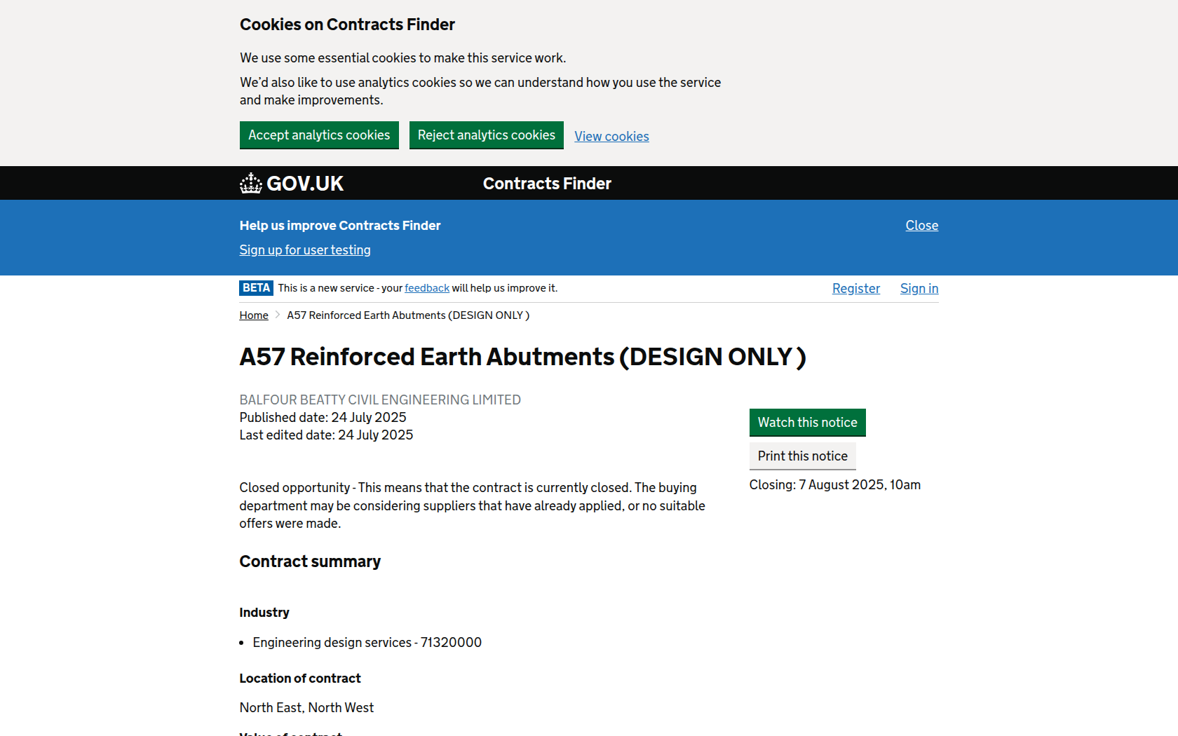 1) Reinforced soil abutment TWs design required to support temporary bridge over A57 - see previous TWs drawing 0002
