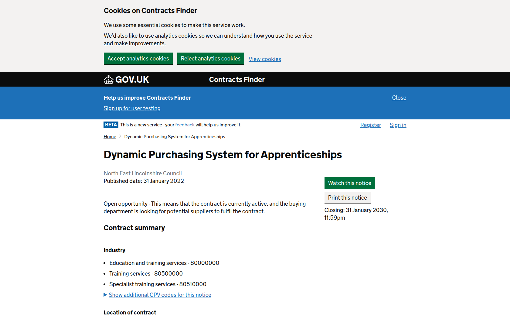 North East Lincolnshire Council (the Authority) is inviting providers to participate in a Dynamic Purchasing System (DPS) for Apprenticeship.