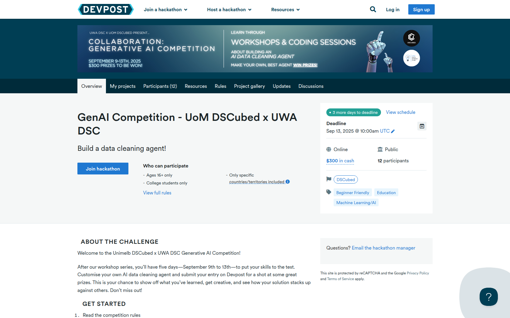 After our workshop series, youβll have five daysβSeptember 9th to 13thβto put your skills to the test. Customise your own AI data cleaning agent and submit your entry on Devpost for a shot at some great prizes. This is your chance to show off what youβve learned, get creative, and see how your solution stacks up against others. Donβt miss out!