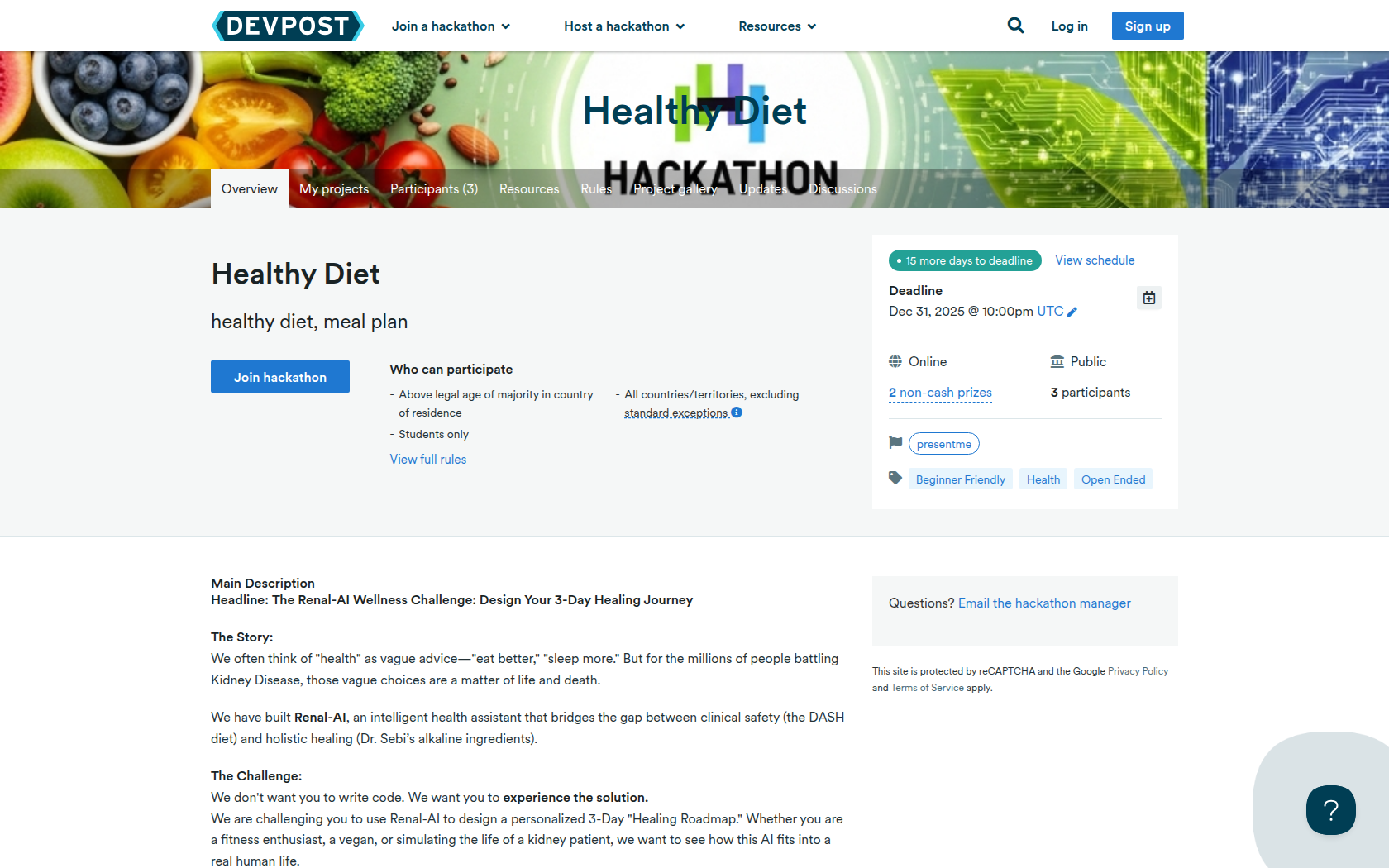 We are challenging you to use Renal-AI to design a personalized 3-Day "Healing Roadmap." Whether you are a fitness enthusiast, a vegan, or simulating the life of a kidney patient, we want to see how this AI fits into a real human life.