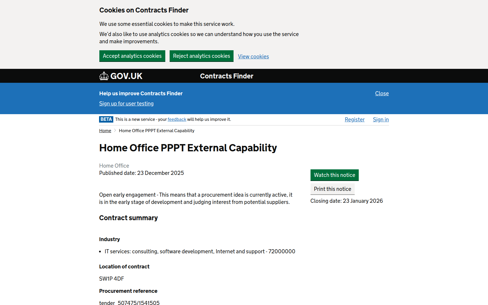 This Early Engagement Notice is being issued by the Home Office (the Authority) to notify the market of a Market Engagement Event seeking views and feedback in relation to the potential procurement of External Capability Commercial Arrangements to its Police & Public Protection Technology unit.