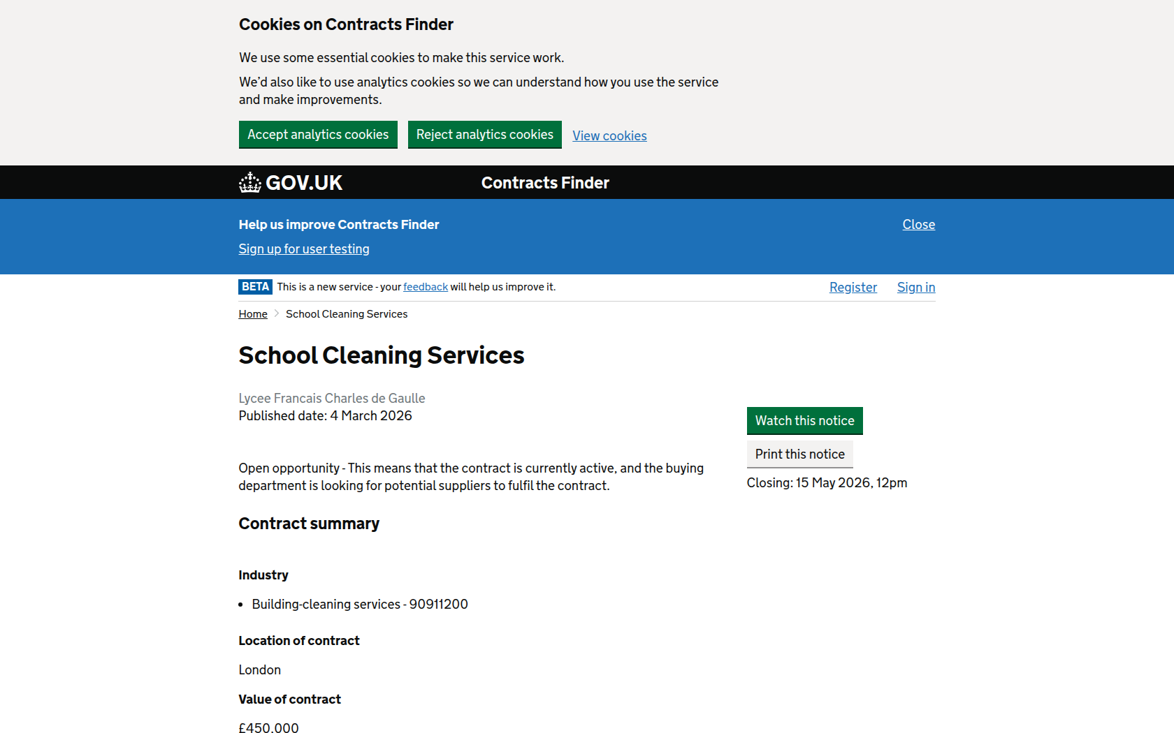 Lycee Francais Charles de Gaulle de Londres (the ? Lycee ?) is a multisite independent school with two Primary branches and is looking of a Cleaning company to provide professional Cleaning Services to these two branches/ schools.