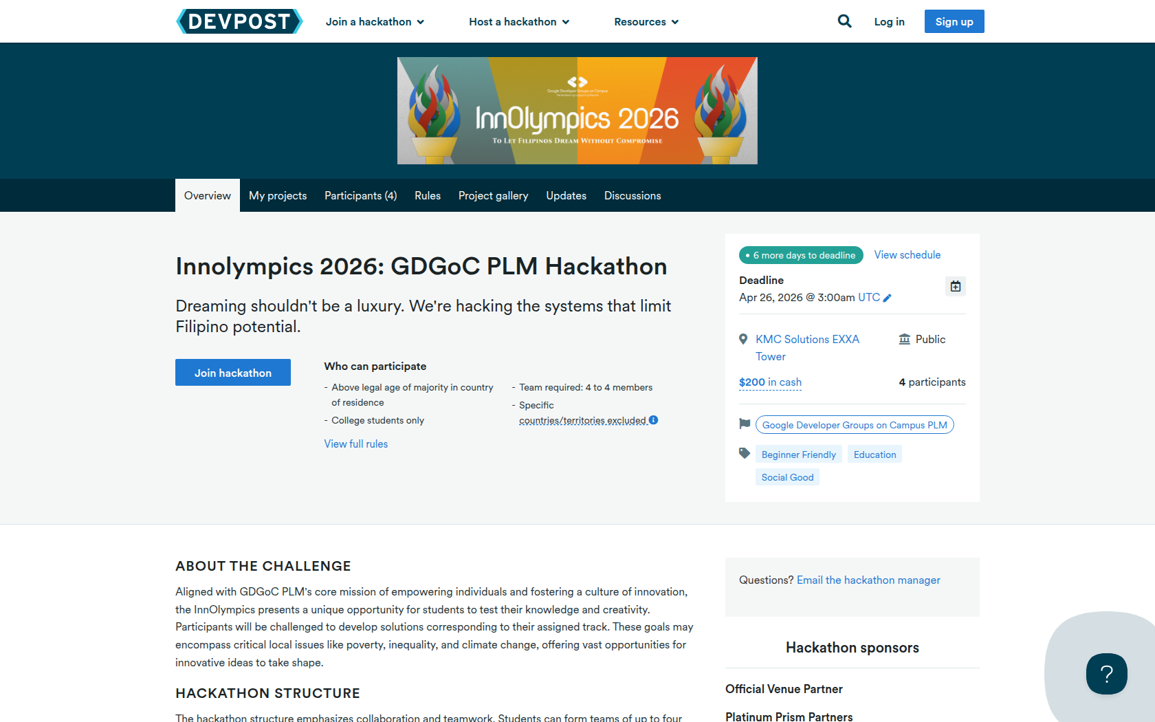 Aligned with GDGoC PLM's core mission of empowering individuals and fostering a culture of innovation, the InnOlympics presents a unique opportunity for students to test their knowledge and creativity. Participants will be challenged to develop solutions corresponding to their assigned track. These goals may encompass critical local issues like poverty, inequality, and climate change, offering vast opportunities for innovative ideas to take shape.