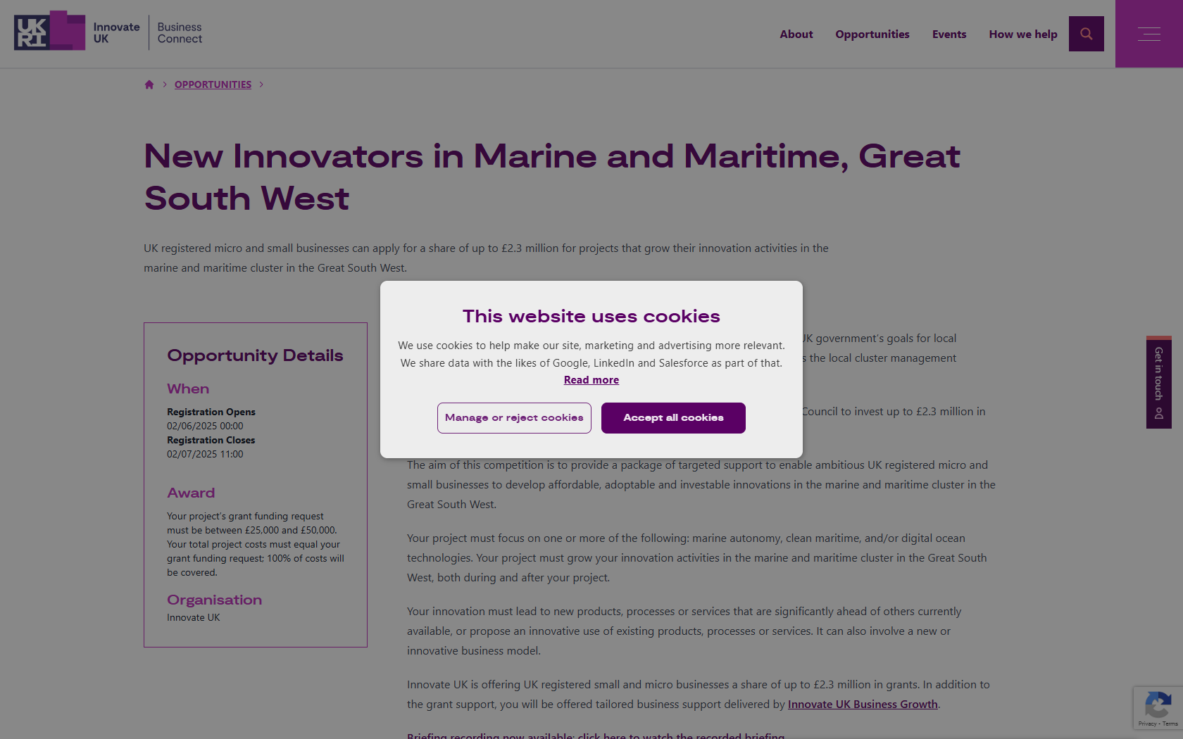 UK registered micro and small businesses can apply for a share of up to £2.3 million for projects that grow their innovation activities in the marine and maritime cluster in the Great South West.