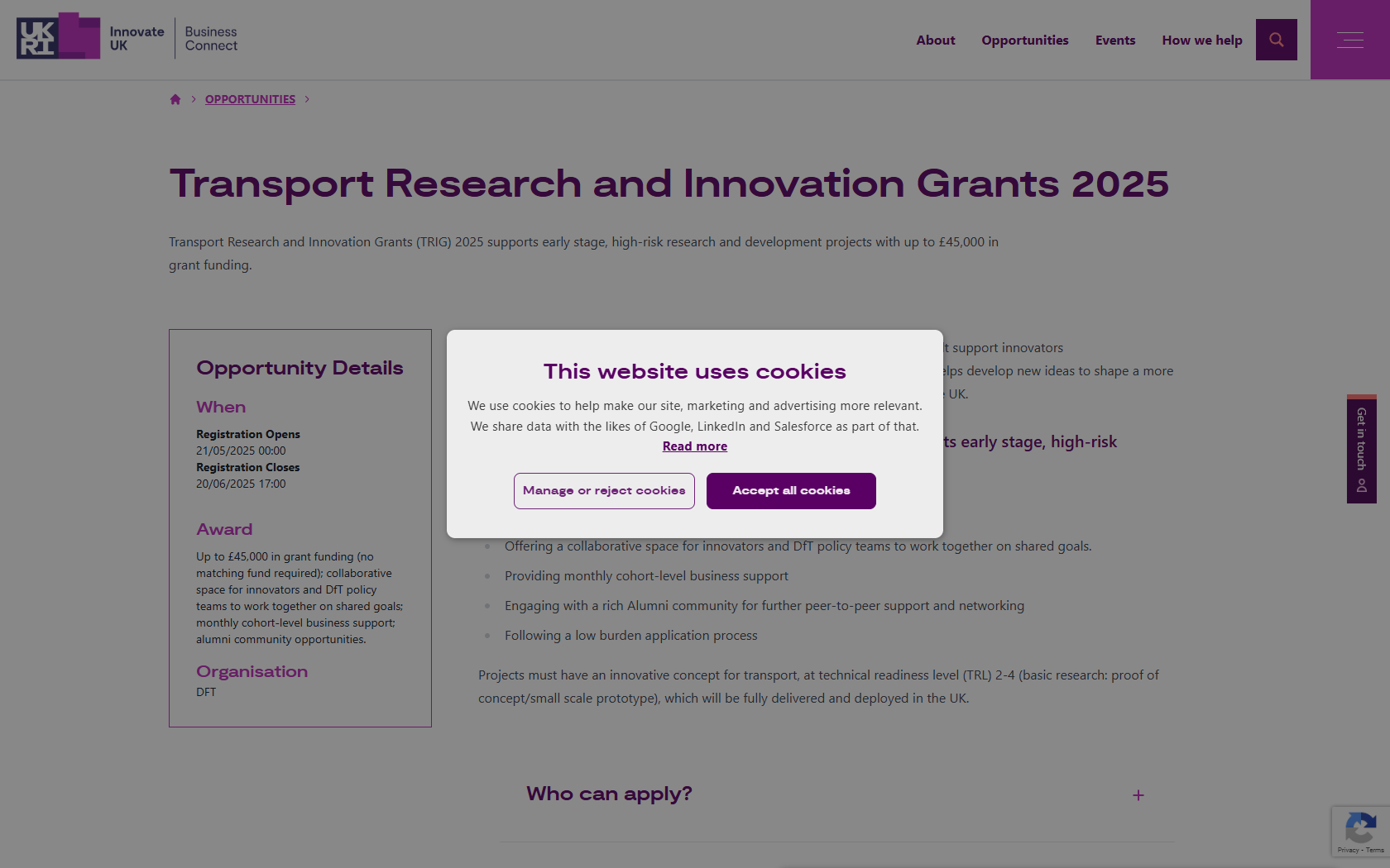 Transport Research and Innovation Grants (TRIG) 2025 supports early stage, high-risk research and development projects with up to ยฃ45,000 in grant funding.