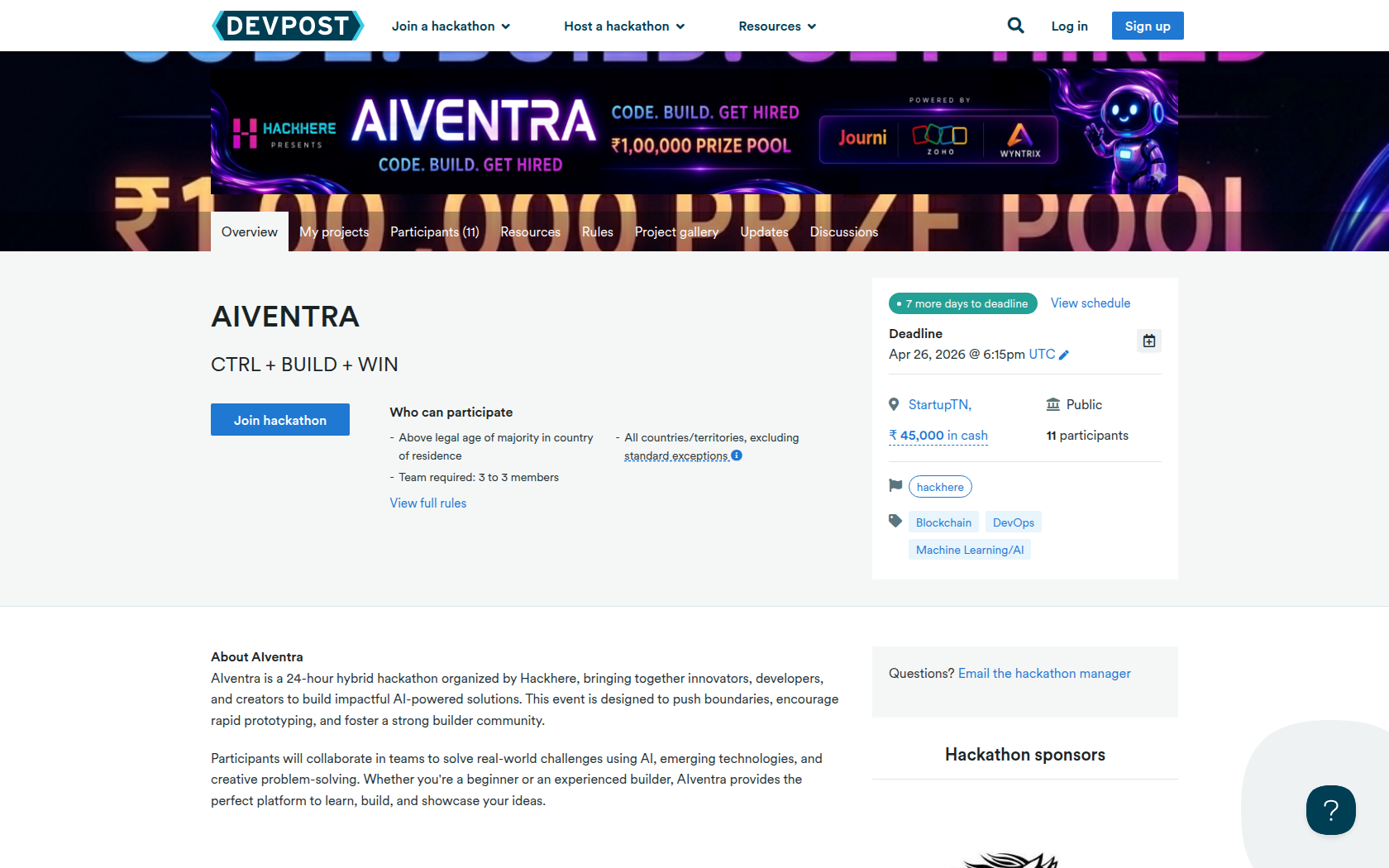 AIventra is a 24-hour hybrid hackathon organized by Hackhere, bringing together innovators, developers, and creators to build impactful AI-powered solutions. This event is designed to push boundaries, encourage rapid prototyping, and foster a strong builder community.