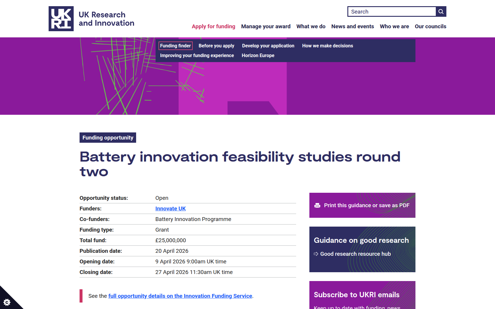 UK registered businesses can apply for a share of up to ยฃ25 million to support innovation in battery grade material technologies for electrification. This funding is from The Battery Innovation Programme.